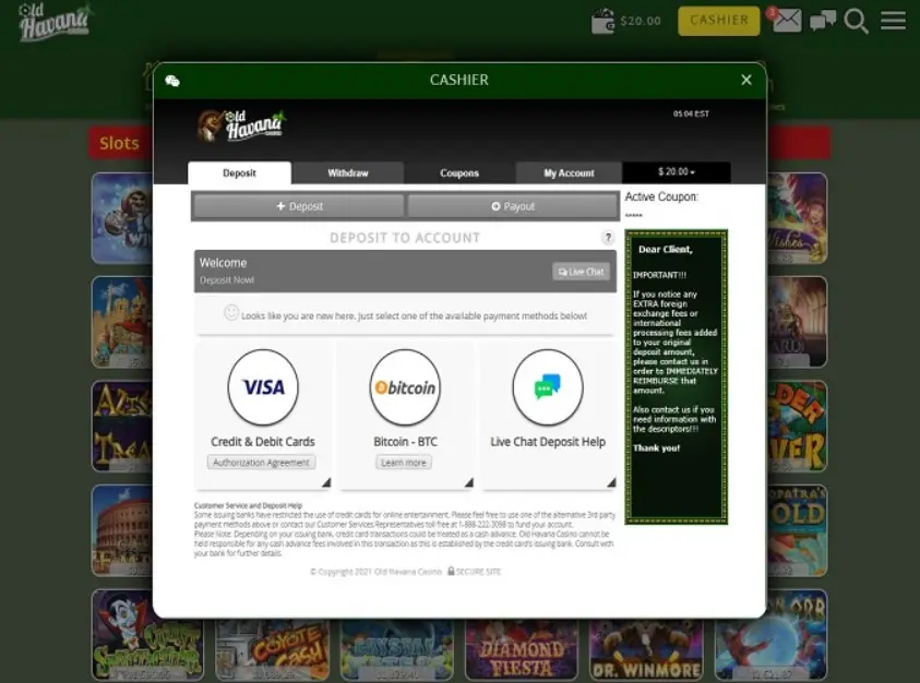 New players can start playing without an initial deposit by taking advantage of this fantastic bonus. With the Old Havana Casino no deposit bonus, players will receive a certain amount of money to use on any games offered at Old Havana Casino. This bonus can be used to try out the different games or to build up a bankroll before making a deposit.